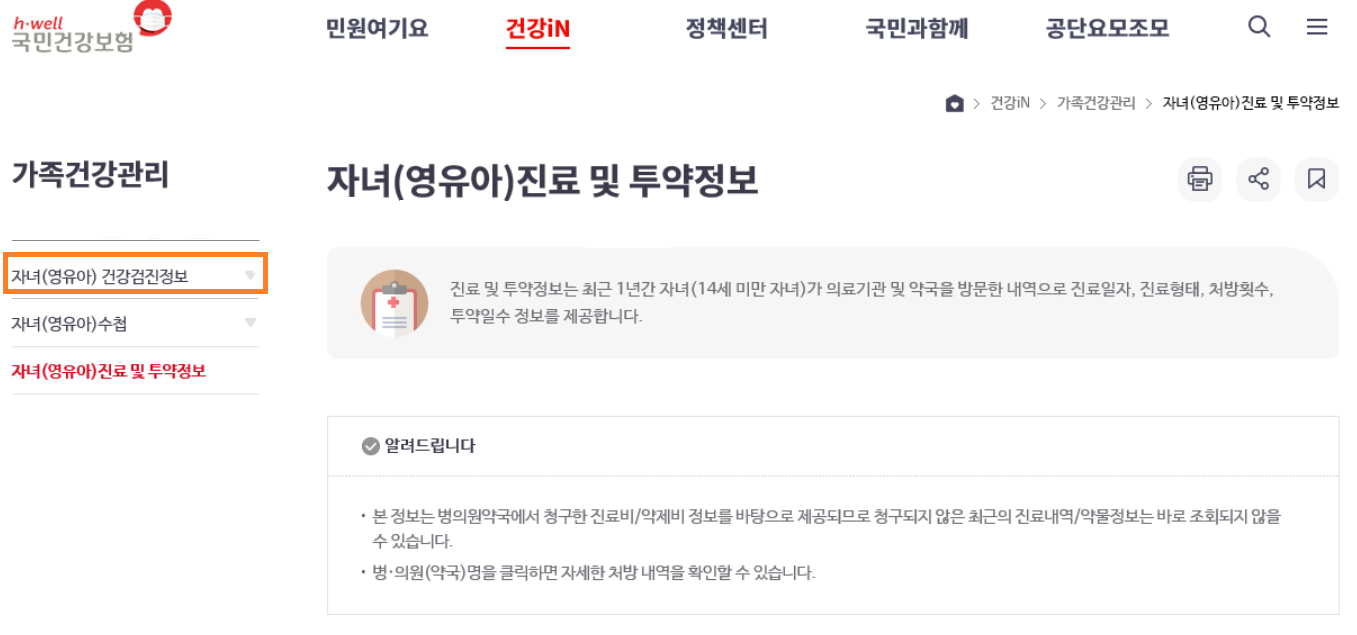 좌측에 자녀(영유아) 건강검진정보를 선택해줍니다.