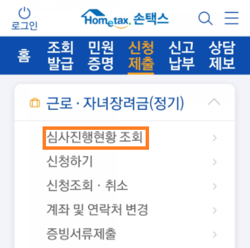 국세청 홈택스 앱인 '손택스'를 설치하고 로그인을 합니다. '신청제출'란에서 심사진행현황 조회를 누릅니다.