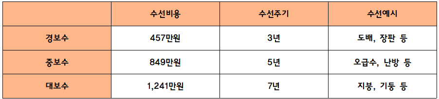 지원합니다. 경보수, 중보수, 대보수로 구분하며 이때 소득인정액별로 수선비용이 감소됩니다.