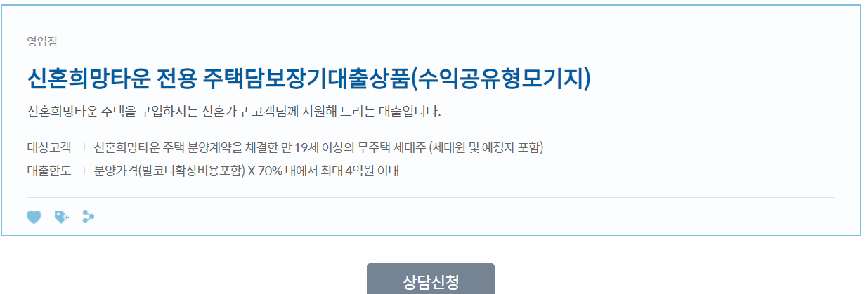 신혼희망타운 전용 주택담보 장기대출은 신한은행 금융상품몰에서 상담신청을 할 수 있습니다.